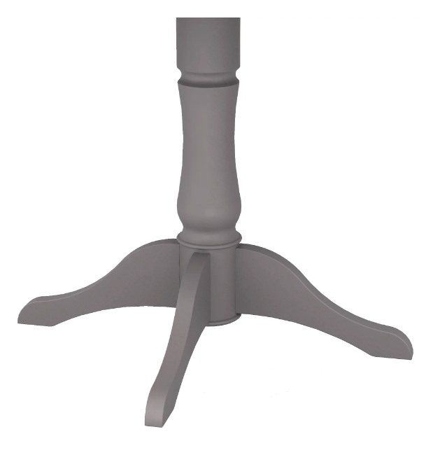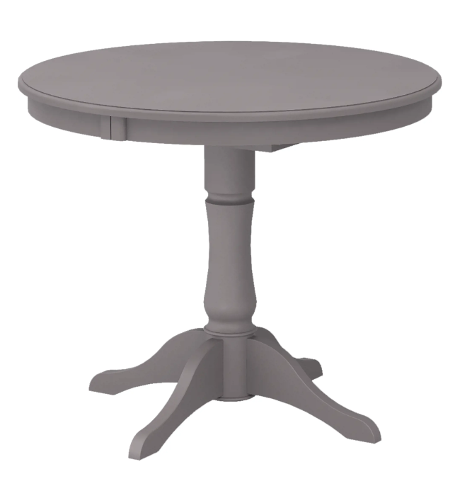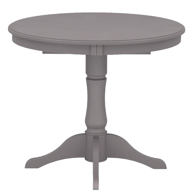 Круглая столешница увеличивается в размере за счет расширения. Диаметр стола в сложенном виде — 90 см, длина с расширительной панелью — 130 см. В сложенном состоянии рассчитан на 2 персоны, в разложенном на 4-6 персон. Столешница изготовлена из МДФ — плит из мелкой древесной стружки, спрессованной под высоким давлением с нагревом. Столешница матовая, устанавливается на устойчивую деревянную ножку с четырьмя опорами. Ножка декорирована простой изящной резьбой, имеет фигурную форму.